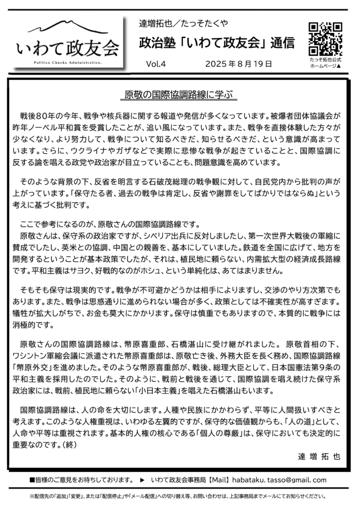 2025年8月19日 政治塾『いわて政友会』通信vol.4のご案内